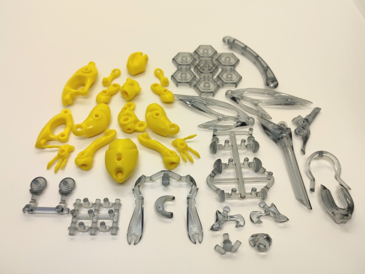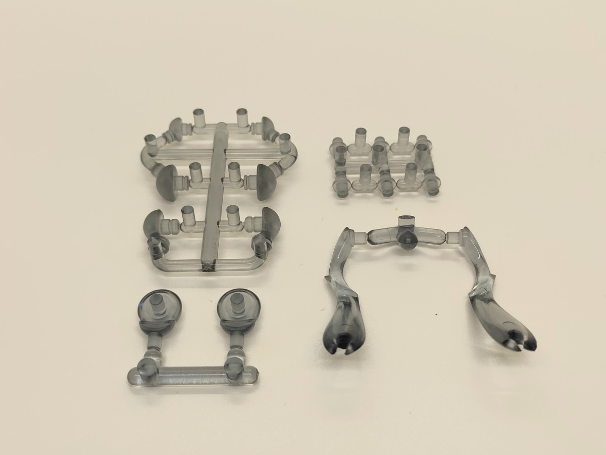パーツを全て並べて見るとこんな感じ。クリアパーツの造型に派手さを感じます。