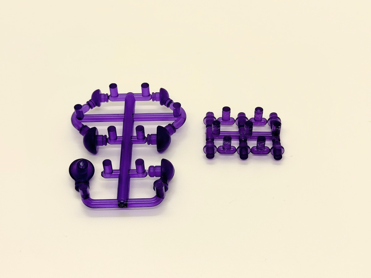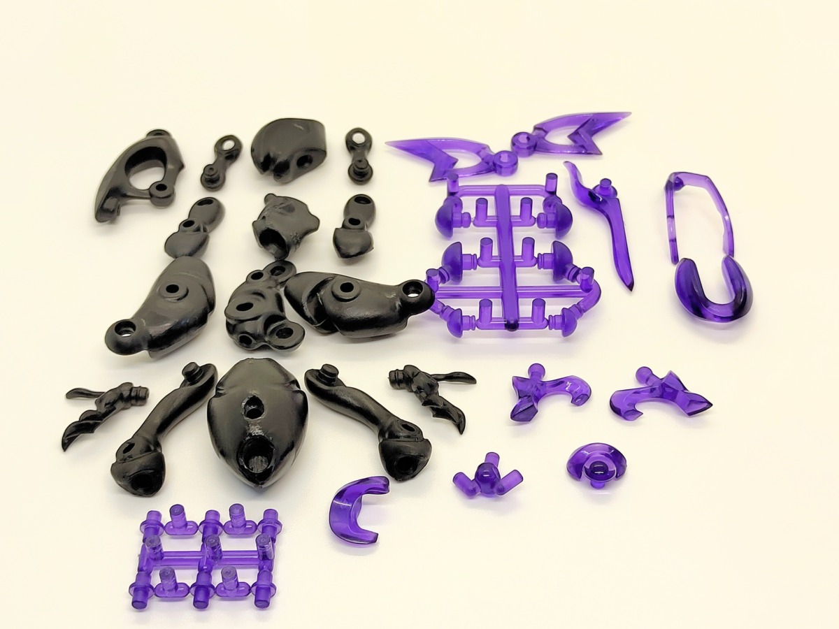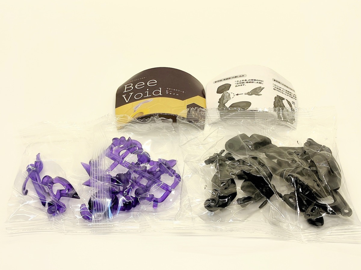 カプセルの中身の内容はこんな感じです。今回は紫×黒の-Toxin-(トキシン)を入手しました。クリアパーツとボディなどのパーツは分けて入っています。ミニブックと組み立て説明書付きです。