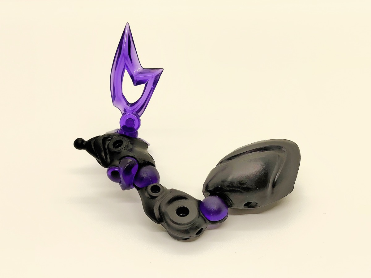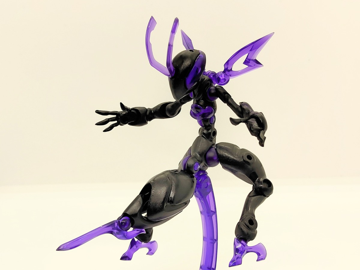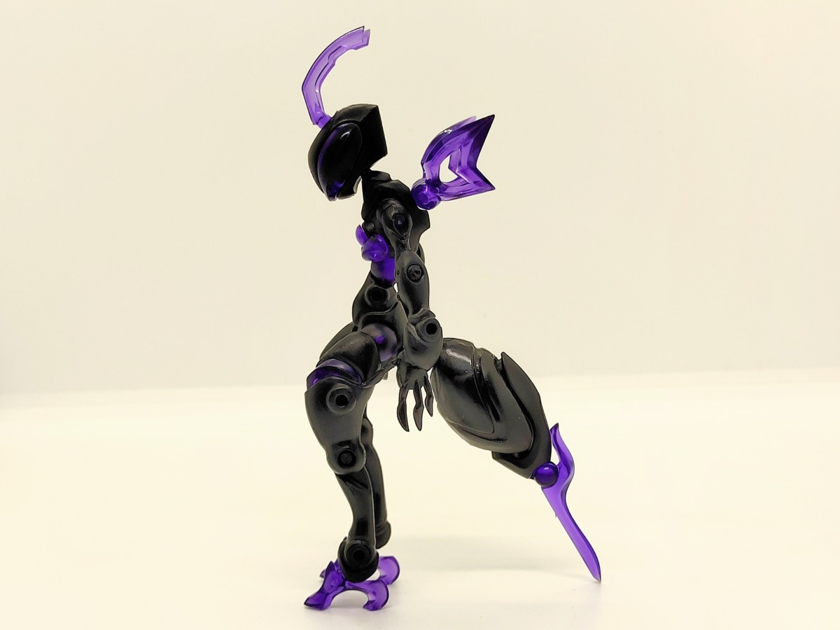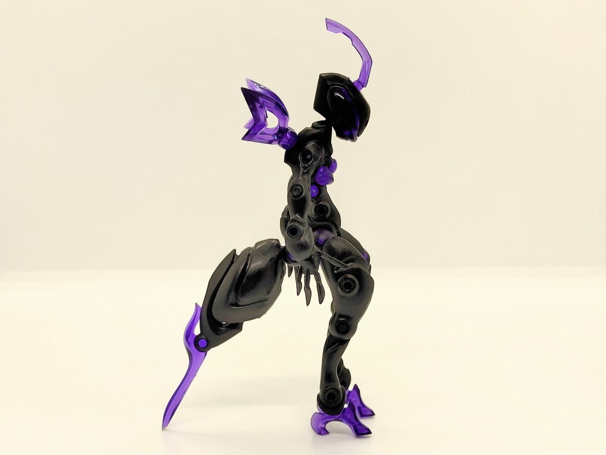 尻尾が前に、脚の関節が逆関節に、眼が離れたデザインになるなど様々な変化があり、より攻撃的な見た目になります。尻尾の武器のジョイントを動かし、今にも刺しそうなポージングもできます。