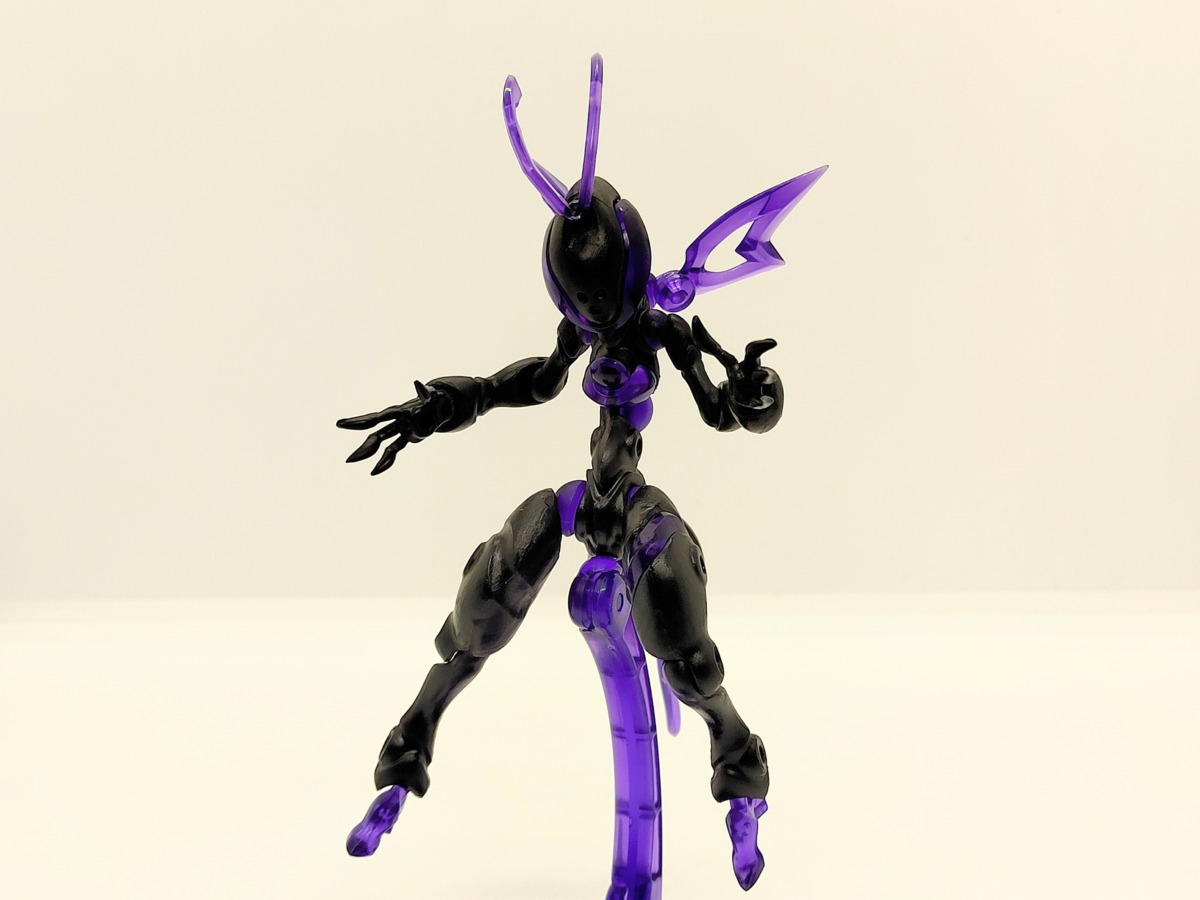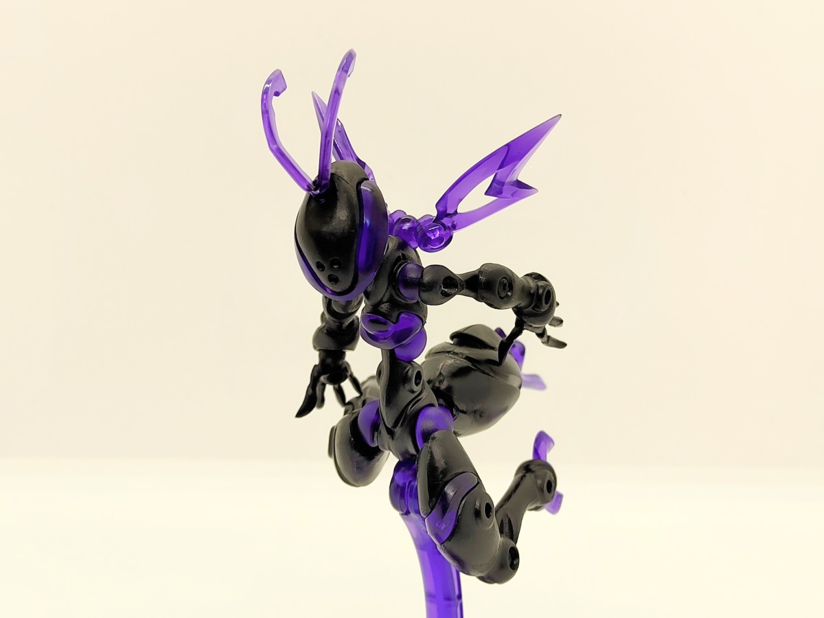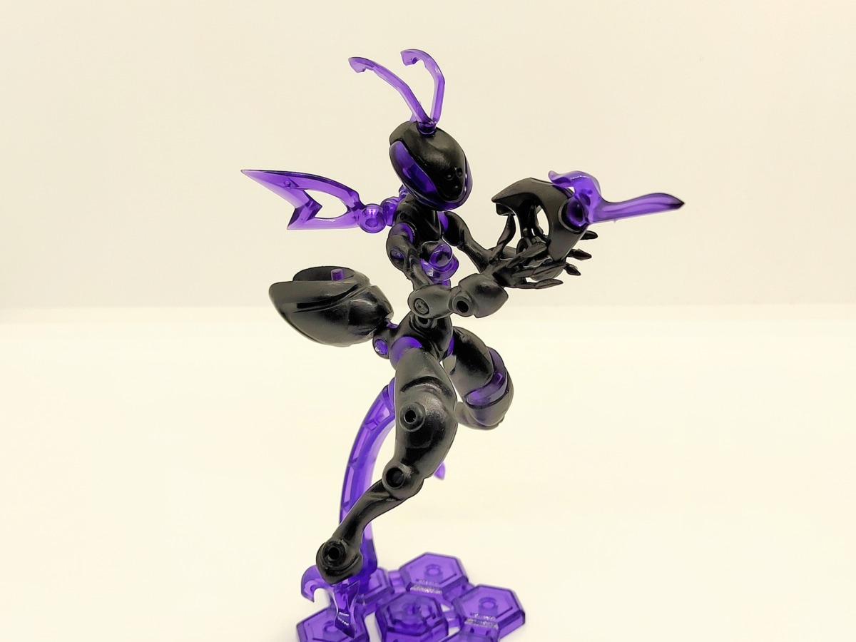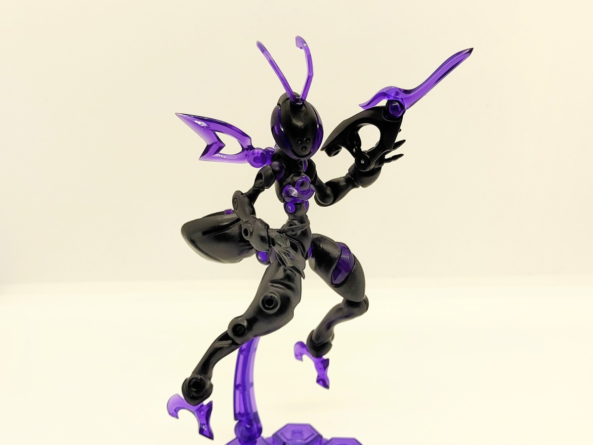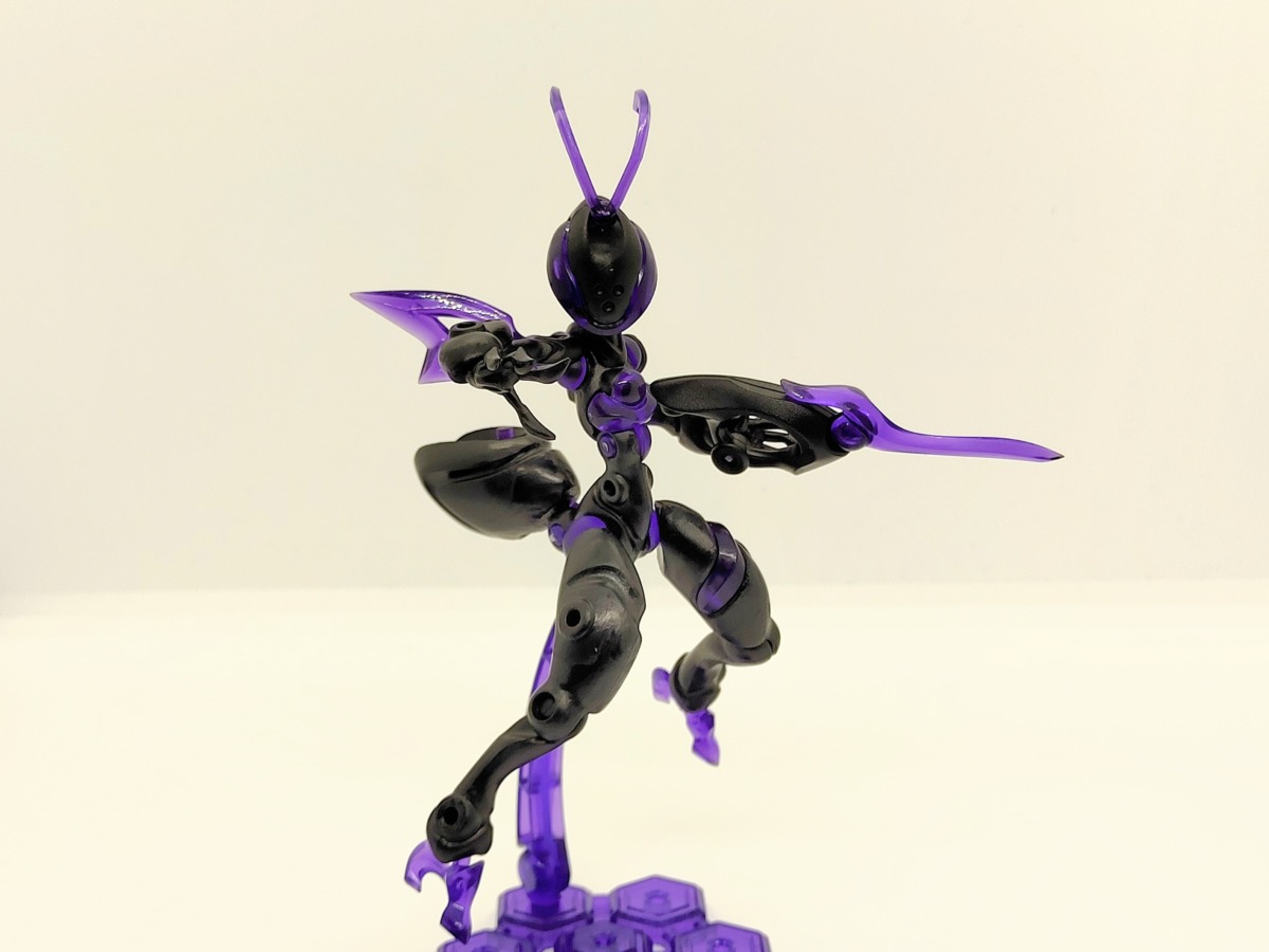 エンハンスド版に付属していた台座を用いてポージングを付けていきます。台座用のジョイント穴は股間部にあり、市販の3㎜穴の台座で代用可能です。蜂がモチーフになっているため、浮遊している風のポージングが映えます。