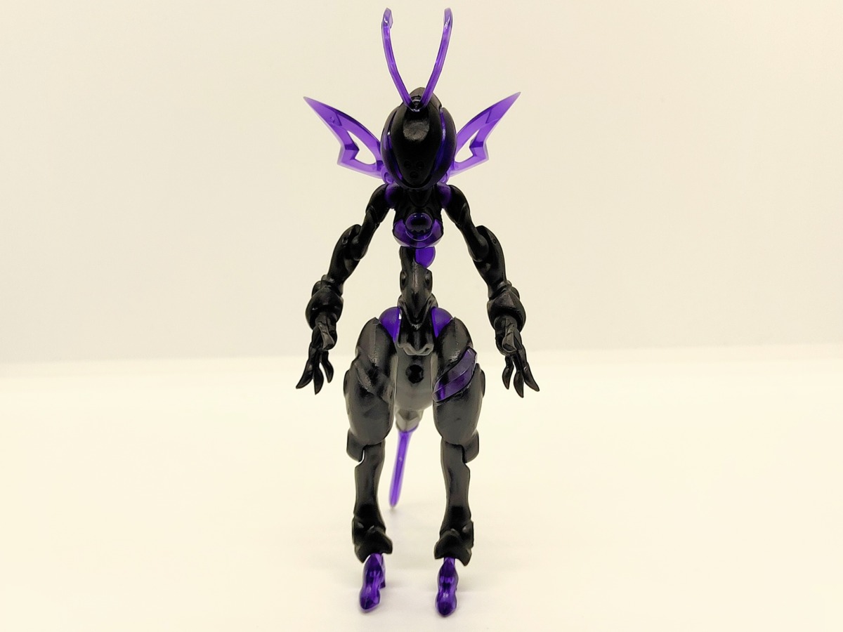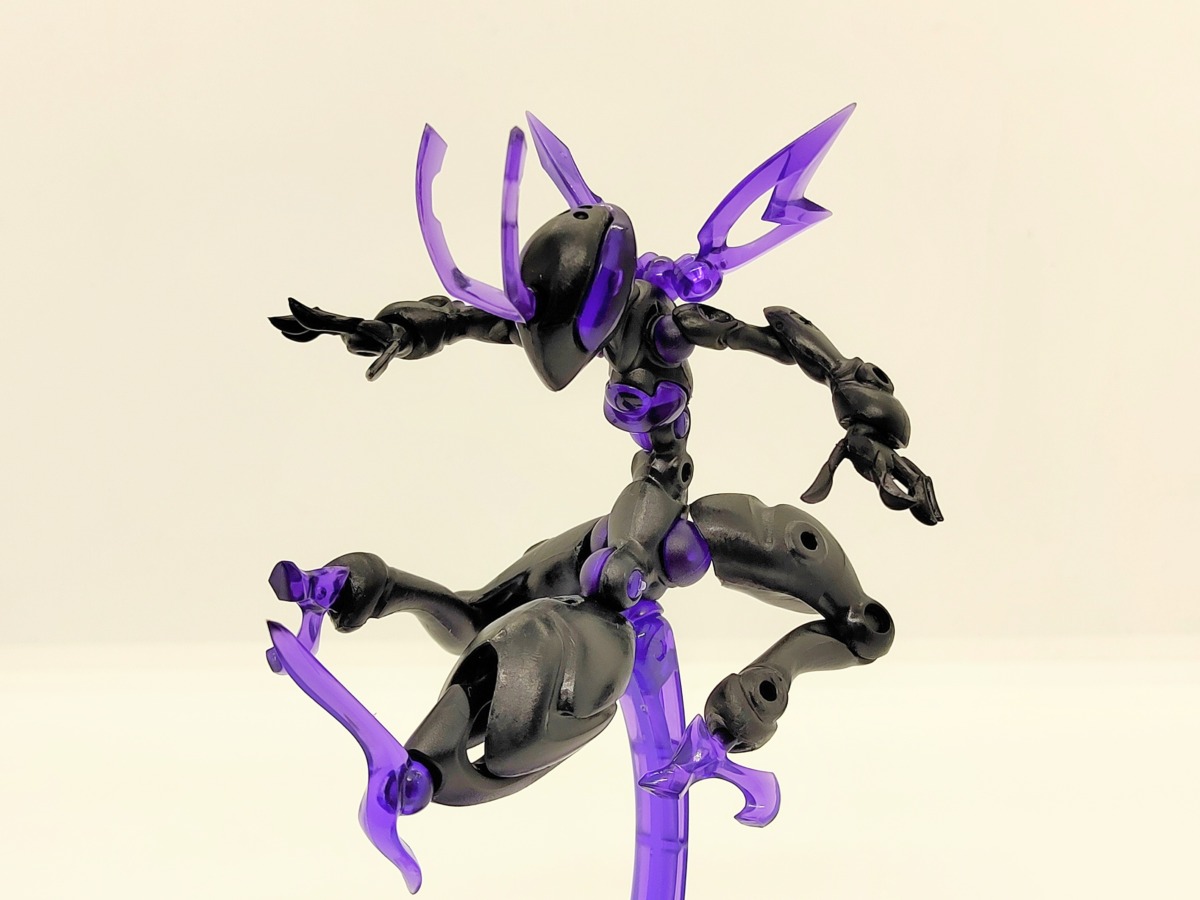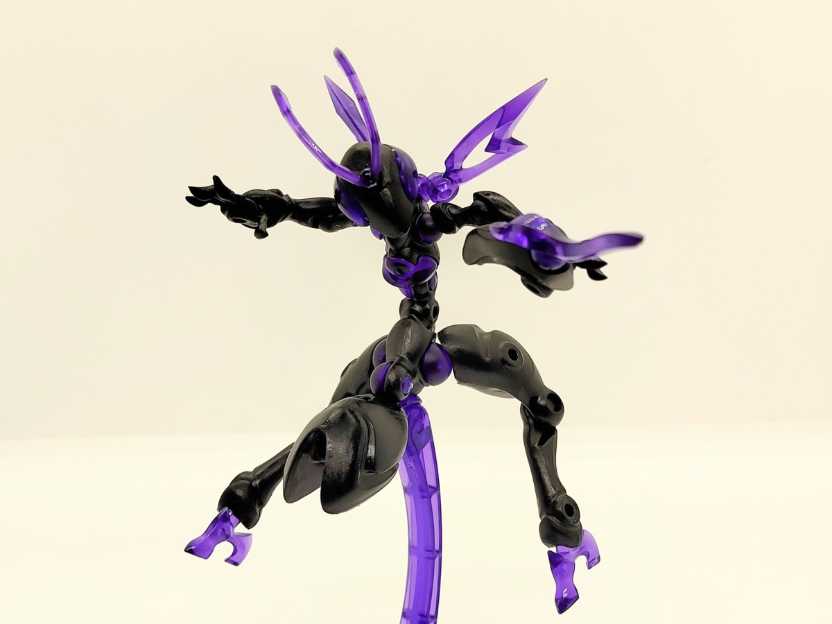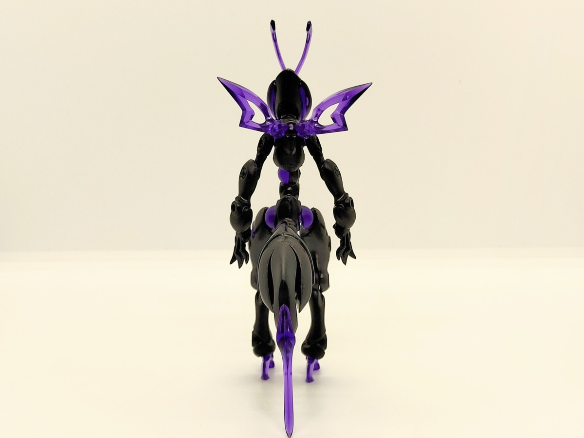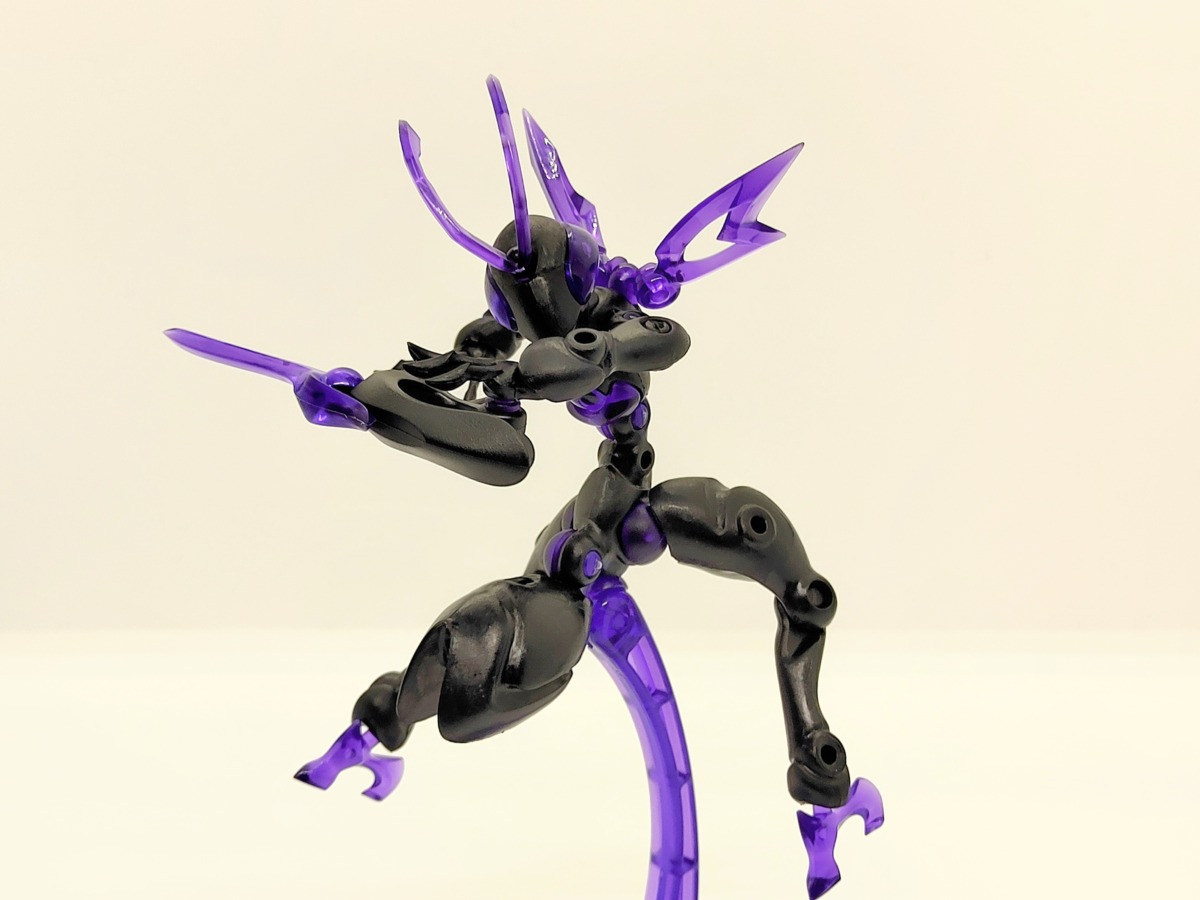 エンハンスド版に付属していた台座を用いてポージングを付けていきます。台座用のジョイント穴は股間部にあり、市販の3㎜穴の台座で代用可能です。蜂がモチーフになっているため、浮遊している風のポージングが映えます。